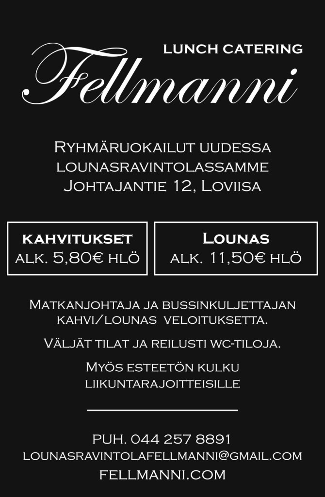 HUOM! Fellmanni on nykyään Lounasravintola Holmari. Tarjoamme maukkaan lounaan ja monipuolisia ryhmäruokailuja Loviisassa ja lähiseudulla. Tutustu lisää uusilla sivuillamme: holmari.fi/ryhmaruokailut